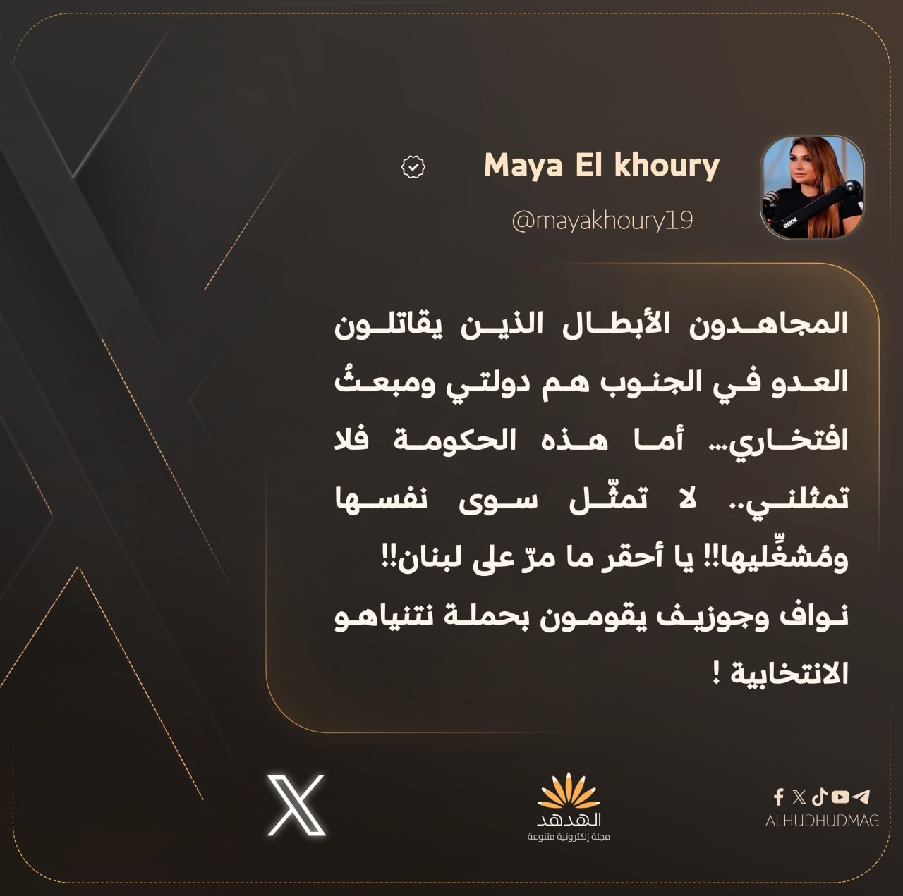 « Ces moujahidoune héroïques qui combattent l’ennemi au Sud sont mon gouvernement et la source de ma fierté… alors que le régime actuel ne me représente pas … il ne représente que lui même et son employeur ! Vous êtes les plus méprisables que le Liban ait connus!